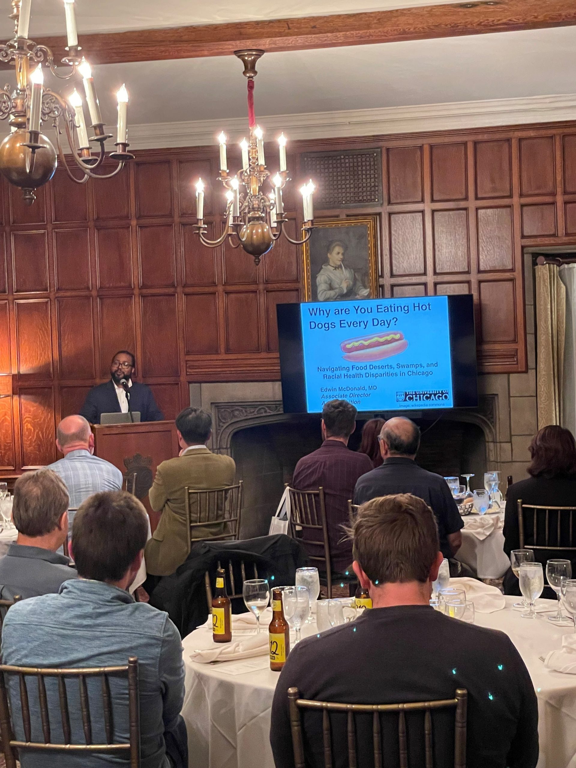 The evening saw a captivating exploration of career development skills through mini-talks and vignettes by experts Manjing Zhang, PhD, Scientific Analyst at Morrison Foerster, and Vanessa Leone, PhD, Assistant Professor of Animal and Dairy Sciences at UW-Madison. The day concluded with a reception and social hour, followed by a science keynote by U Chicago’s Dr. Edwin McDonald entitled “Why are you eating hot dogs every day?” which navigated food swamps, food deserts, and health disparities.